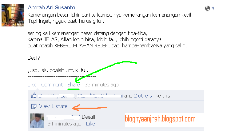 Bukti kalau postingan anda sudah di share, bisa tau dari munculnya tanda yang ditunjukan oleh tanda panah warna coklat.So, Kalau menemukan hal-hal bagus silakan untuk me Retweets facebook-annya.