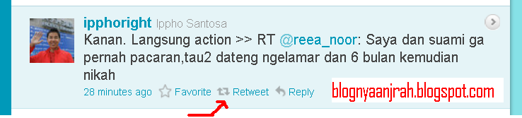 Gambar di atas menunjukan Twitnya pak Ippho santosa, nama akun tweeternya ipphoright Tombol retweet di tunjukan tanda panah warna merah. Pada kondisi di atas, pak ippho retweet statusnya @reea_noor, tu ada tandannya tulisan RT.